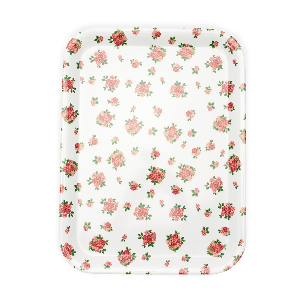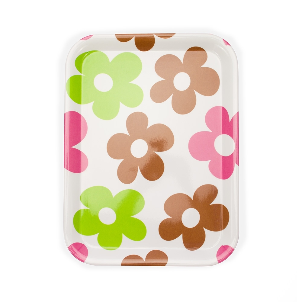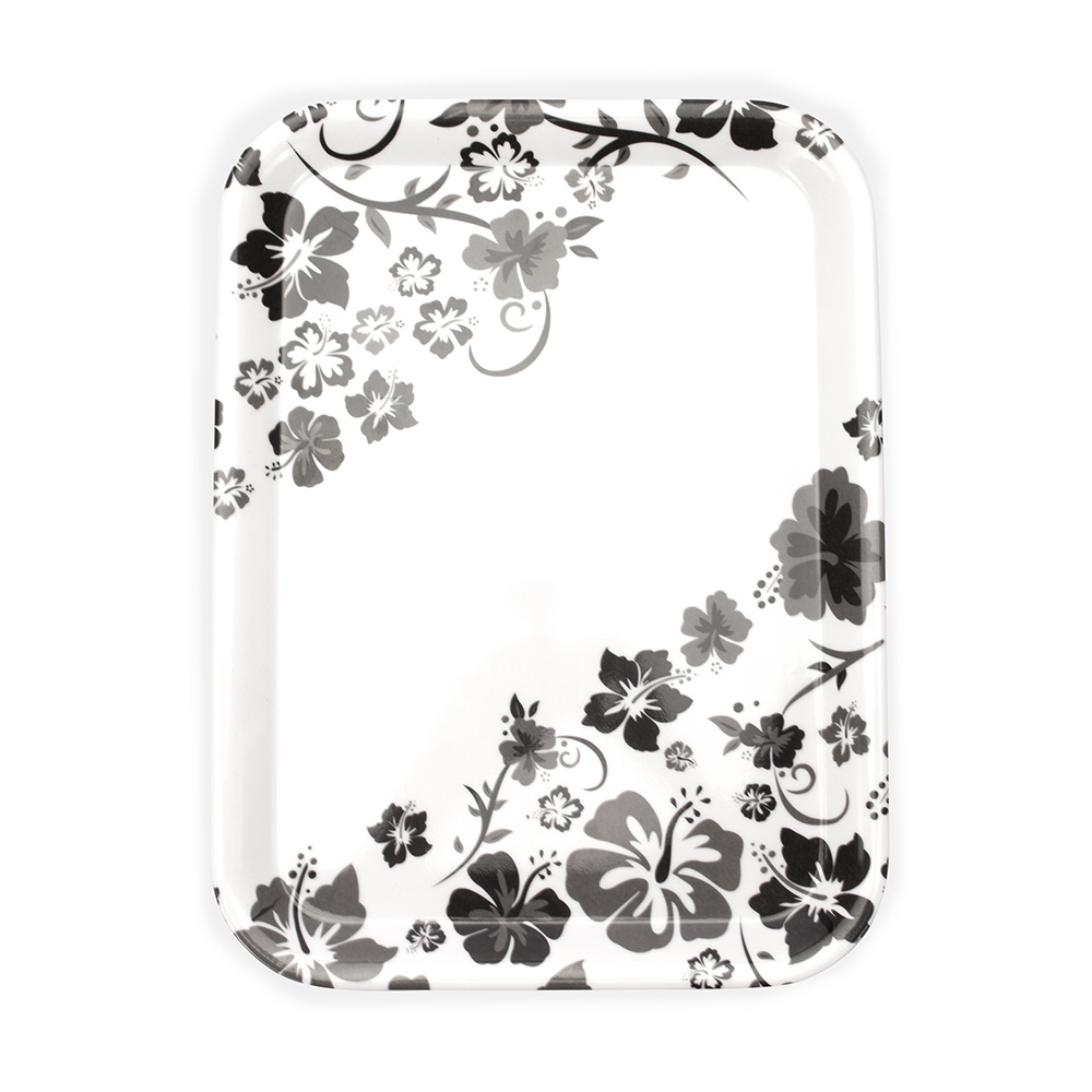 Uma bandeja retangular feita em melamina, material conhecido pela resistência a impactos, leveza e facilidade de limpeza e também por não reter cheiro nem sabor.